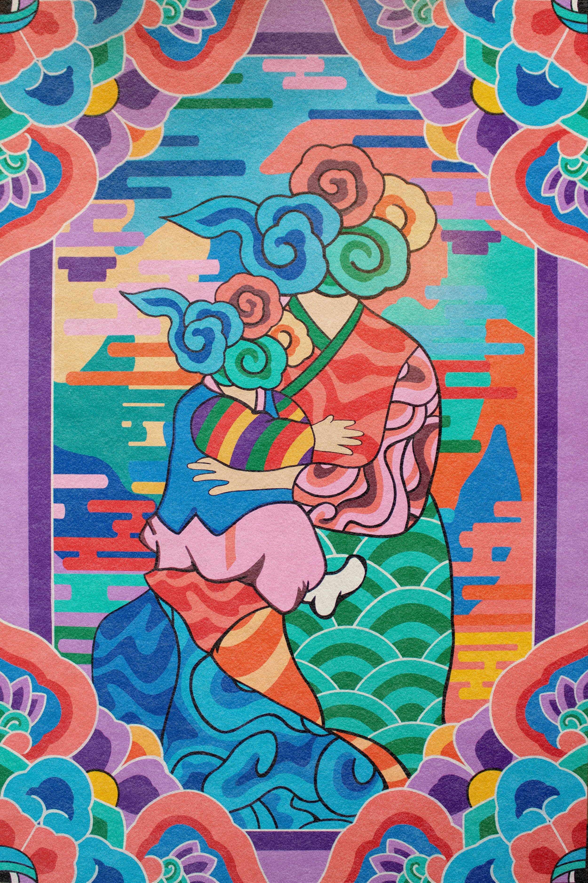Halbur’s work embodies a synthesis of visual traditions, merging the ornate geometry and spiritual symbolism of Korean Dancheong and the folkloric storytelling of Minhwa with the fluid motion and expressive linework of early 20th-century American animation—often referred to as the “rubber hose” style popularized by studios like Fleischer and Disney. Layered with the bold color palettes and experimental spirit of the 1960s psychedelic art movement, his imagery bridges cultural and stylistic worlds. Through this fusion of Eastern ornamentation and Western animation, Halbur constructs a vibrant visual language that is both nostalgic and exploratory—anchored in heritage, yet expanding through the imaginative language of Western art