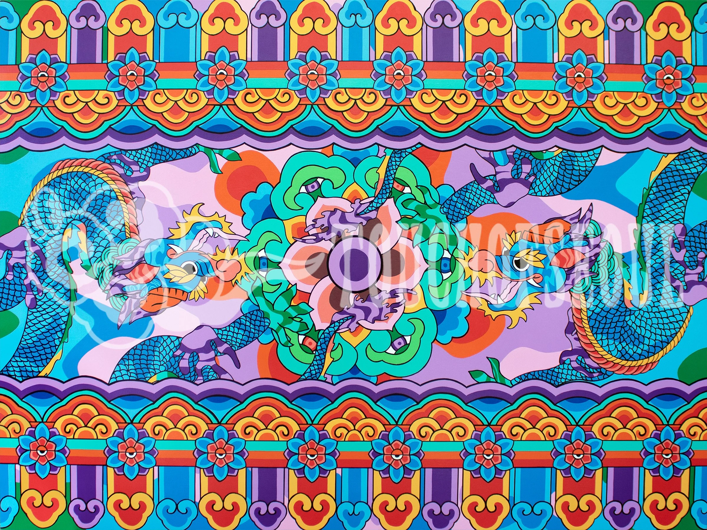 Colorful traditional Asian art featuring two blue and yellow dragons surrounding a central floral motif, with intricate patterns and decorative borders in vibrant hues.