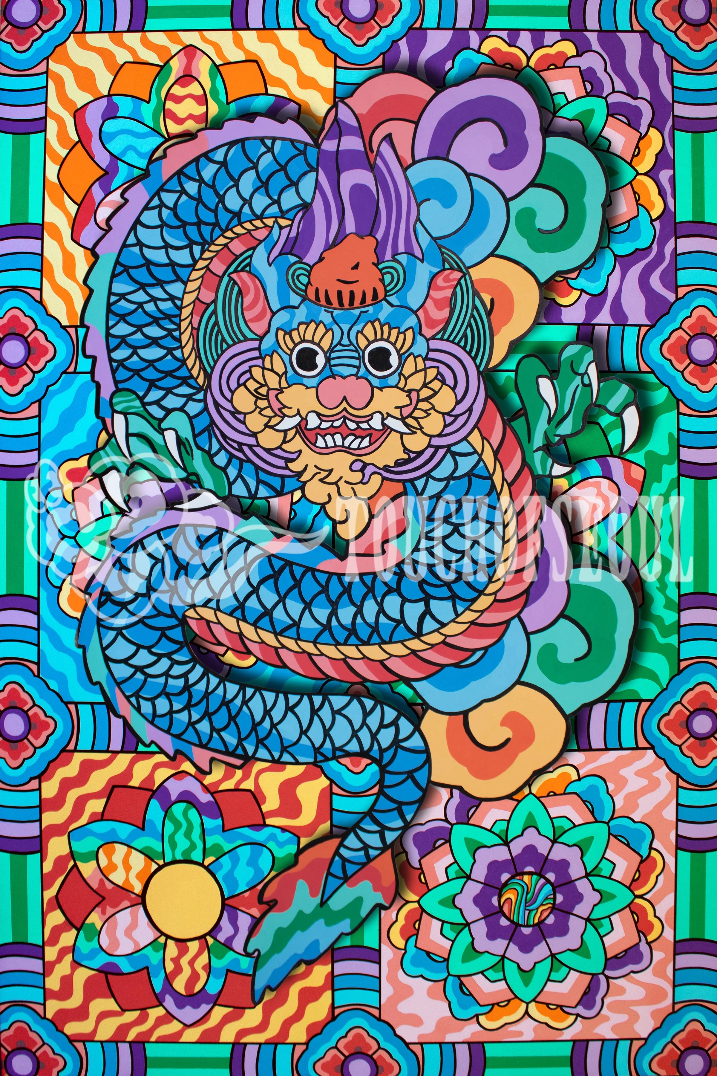 Colorful, intricate illustration of a dragon with a lion-like face, surrounded by vibrant decorative floral patterns.